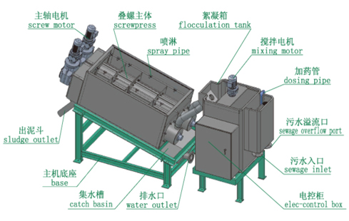 4.絮凝箱:用于污泥與PAM絮凝劑的混合、絮凝,絮凝好的污泥由絮凝箱流至疊螺主體中