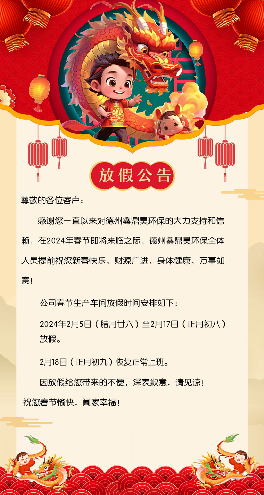 尊敬的各位客戶: 感謝您一直以來(lái)對(duì)德州鑫鼎昊環(huán)保的大力支持和信賴,在2024年春節(jié)即將來(lái)臨之際,德州鑫鼎昊環(huán)保全體人員提前祝您新春快樂(lè),財(cái)源廣進(jìn),身體健康,萬(wàn)事如意!